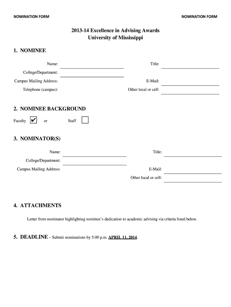 NOMINATION FORM 201314 Excellence in Advising Awards University of Mississippi 1. NOMINEE Name: Title: College/Department: Campus Mailing Address: Email: Telephone (campus): Other local or cell: 2.