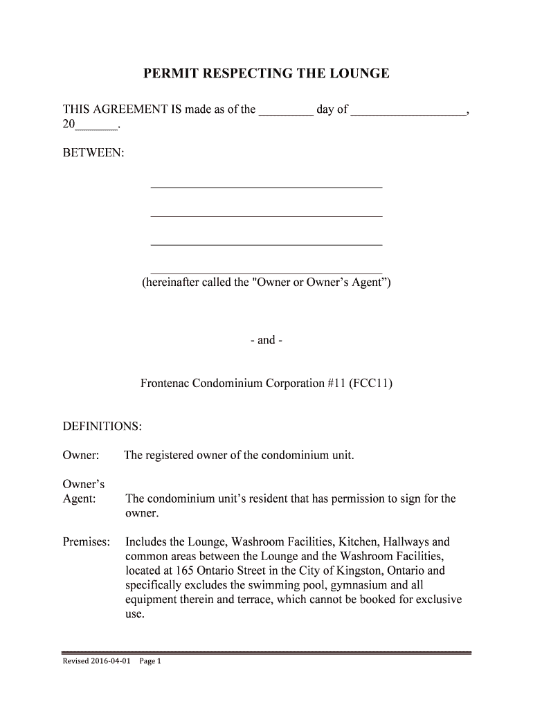 PERMIT RESPECTING THE LOUNGE THIS AGREEMENT IS made as of the day of, 20. BETWEEN: (hereinafter called the “Owner or Owners Agent) and Frontenac Condominium Corporation #11 (FCC11) DEFINITIONS: