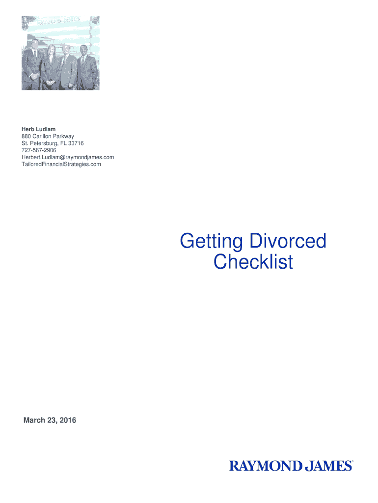 Herb Lula 880 Carillon Parkway St. Petersburg, FL 33716 7275672906 Herbert. Lula raymondjames.com TailoredFinancialStrategies. Competing Divorced Checklist March 23, 2016Getting Divorced Checklist