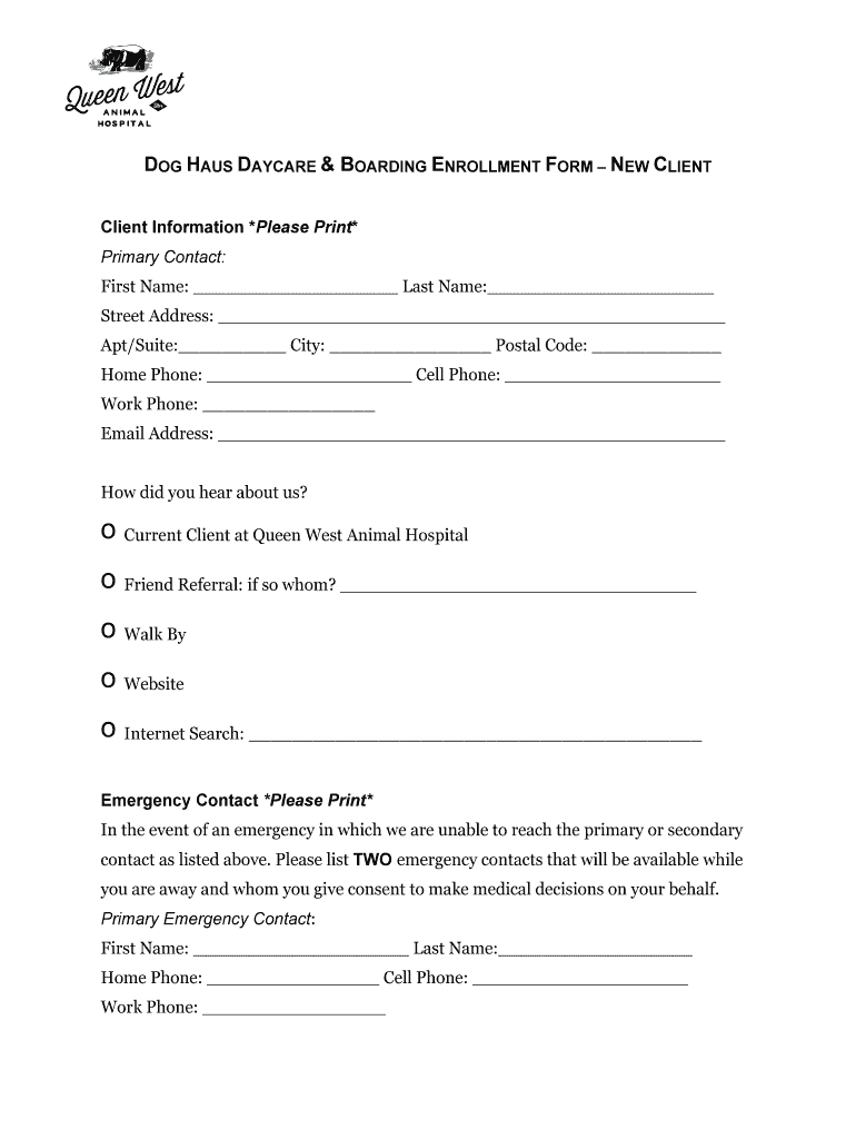 DOG HAS DAYCARE & BOARDING ENROLLMENT FORM NEW CLIENT Information *Please Print* Primary Contact: First Name: Last Name: Street Address: Apt/Suite: City: Postal Code: Home Phone: Cell Phone: Work