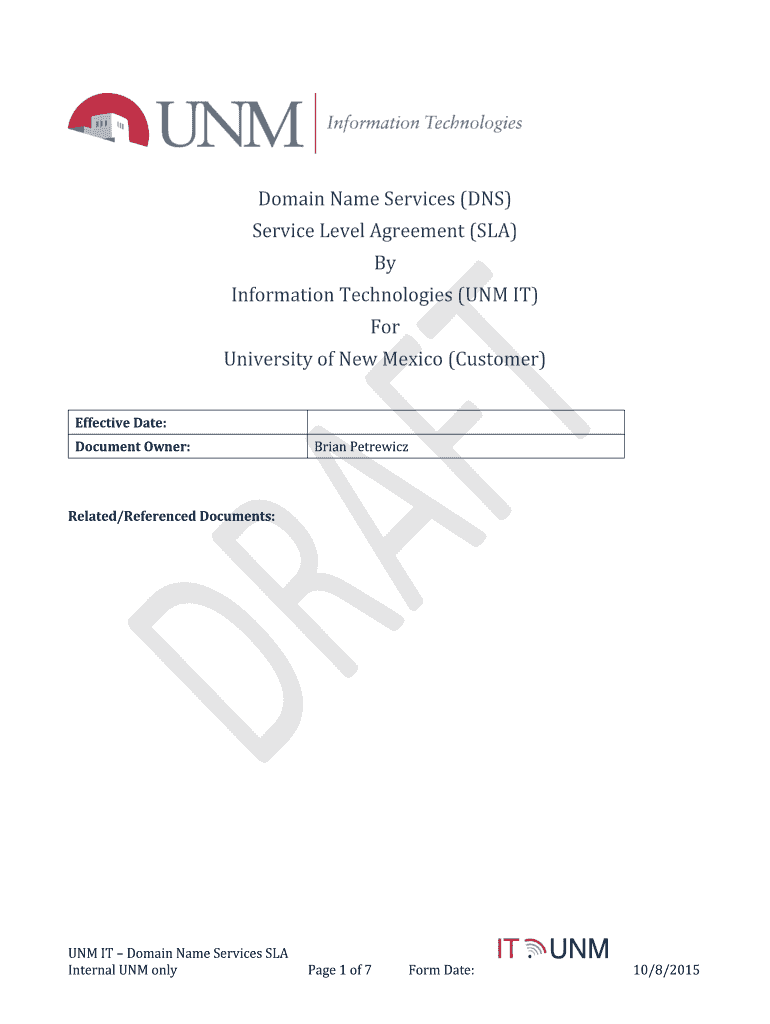 Domain Name Services (DNS) Service Level Agreement (SLA) By Information Technologies (UNM IT) For University of New Mexico (Customer) Effective Date: Document Owner: Brian Petrovich Related/Referenced