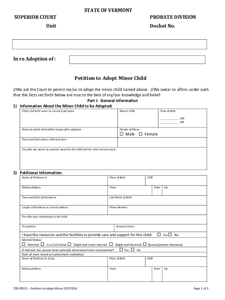 STATE OF VERMONT SUPERIOR COURT PROBATE DIVISION Unit Docket No. In re Adoption of : Petition to Adopt Minor Child I/We ask the Court to permit me/us to adopt the minor child named above. I/We swear