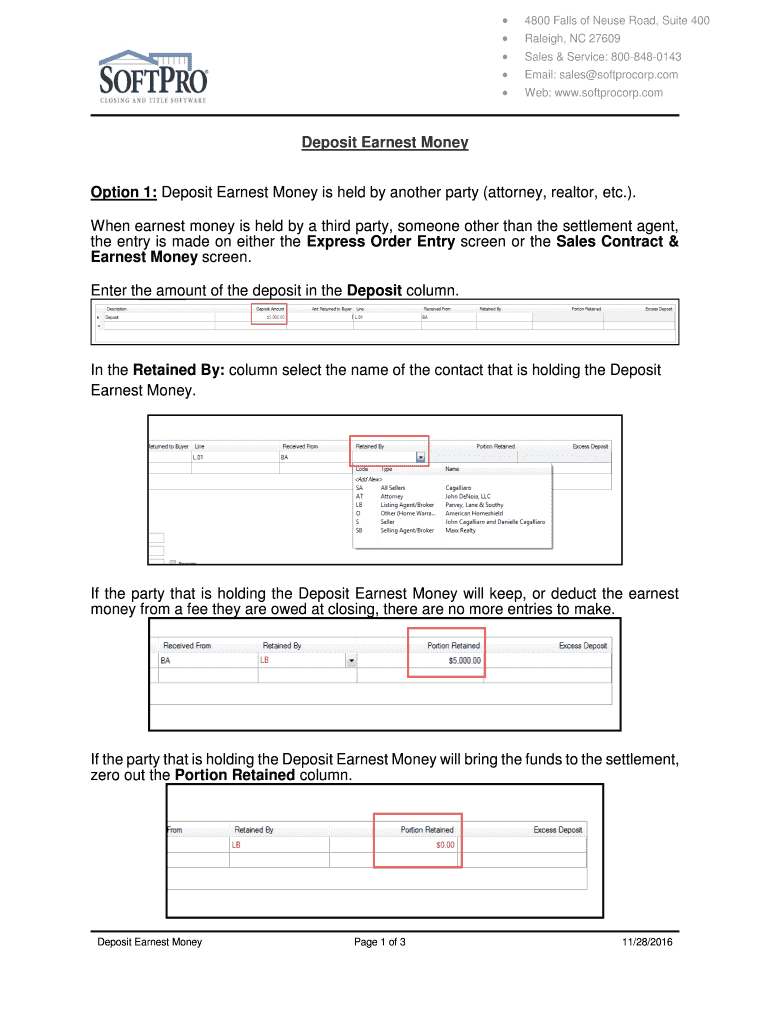 4800 Falls of Reuse Road, Suite 400 Raleigh, NC 27609 Sales & Service: 8008480143 Email: sales softprocorp.com Web: www.softprocorp.comDeposit Earnest Money Option 1: Deposit Earnest Money is held