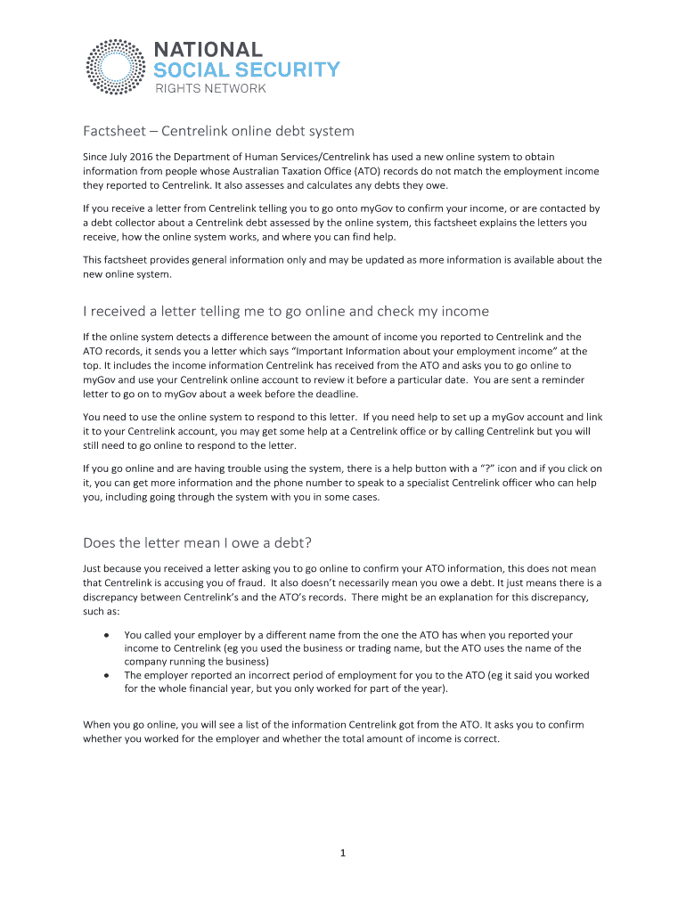 Fact sheet Centrelink online debt system Since July 2016 the Department of Human Services/Centrelink has used a new online system to obtain information from people whose Australian Taxation Office