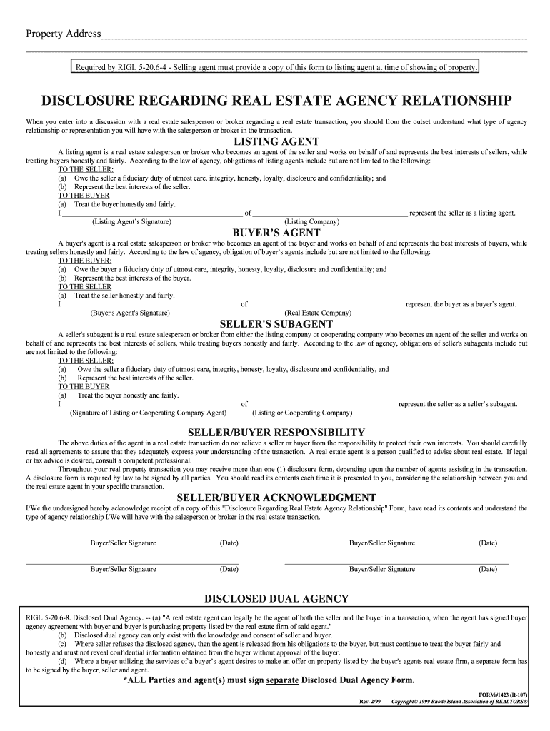 Is notarization required for the Disclosure Regarding Real Estate Agency Relationship in Rhode Island?