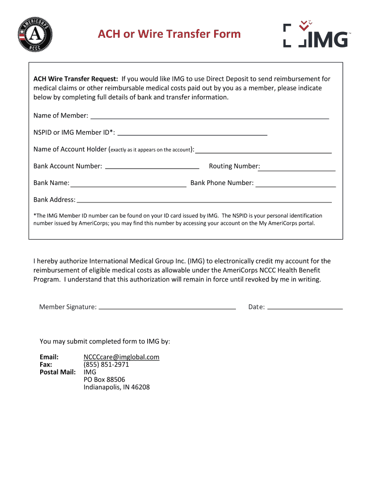 ACH or Wire Transfer Form ACH Wire Transfer Request: If you would like IMG to use Direct Deposit to send reimbursement for medical claims or other reimbursable medical costs paid out by you as a member,