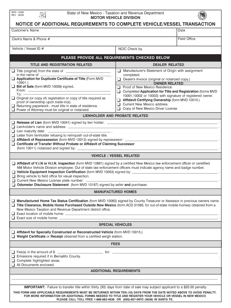 State of New Mexico Taxation and Revenue Department MOTOR VEHICLE DIVISION MVD 10282 REV. 09/08NOTICE OF ADDITIONAL REQUIREMENTS TO COMPLETE VEHICLE/VESSEL TRANSACTION Customer's NameDateClerk's Name