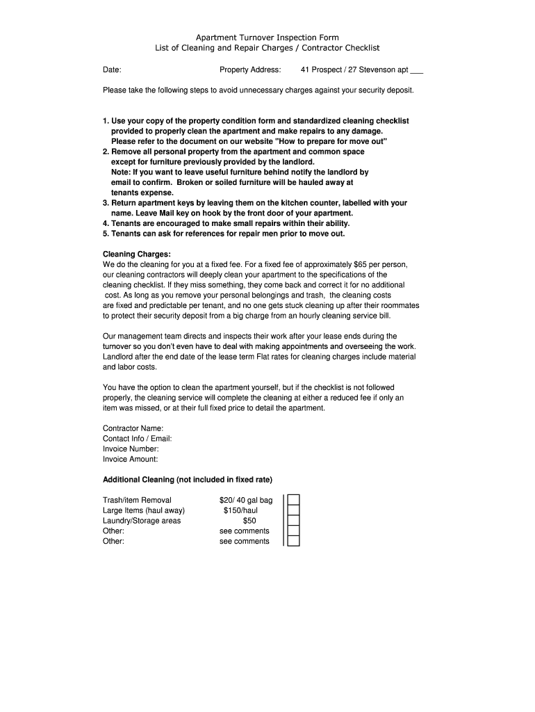 Apartment Turnover Inspection Form List of Cleaning and Repair Charges / Contractor Checklist Date:Property Address:41 Prospect / 27 Stevenson apt Please take the following steps to avoid unnecessary