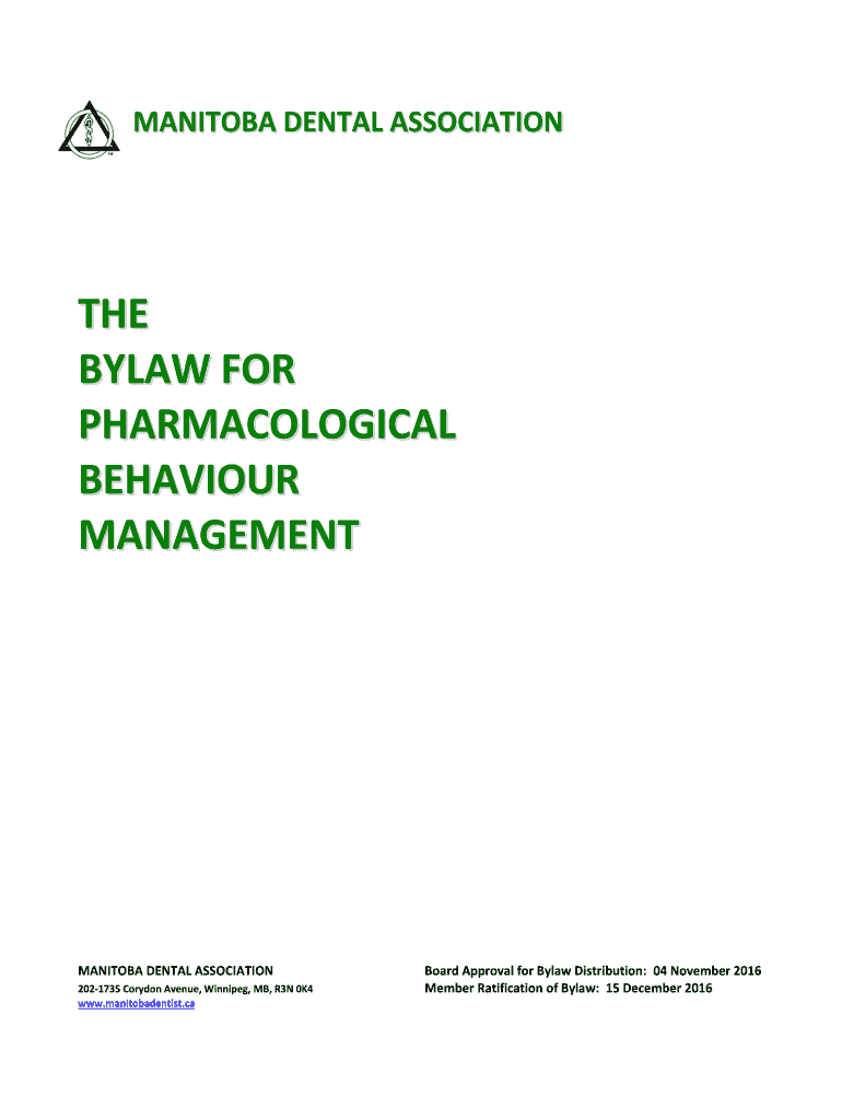 MANITOBA DENTAL ASSOCIATION THE BYLAW FOR PHARMACOLOGICAL Behavior MANAGEMENT MANITOBA DENTAL ASSOCIATION 2021735 Cordon Avenue, Winnipeg, MB, R3N 0K4 www.manitobadentist.ca Board Approval for Bylaw