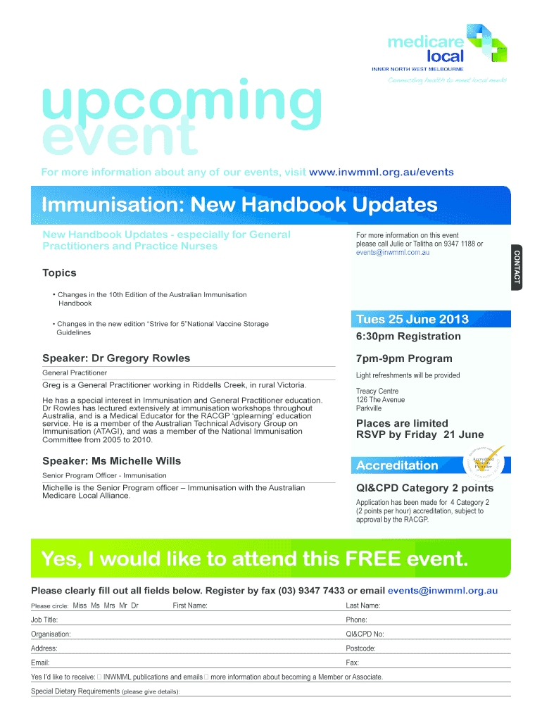 Upcoming vent e For more information about any of our events, visit www.inwmml.org.au/events Immunization: New Handbook Updates For more information on this event please call Julie or Tabitha on 9347