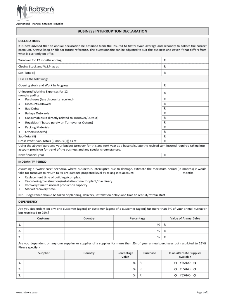 The Business Interruption Declaration Form is a financial document used by businesses to declare details crucial for assessing the impact of potential interruptions.