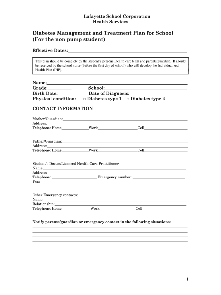 Lafayette School Corporation Health Services Diabetes Management and Treatment Plan for School (For the non pump student) Effective Dates: This plan should be complete by the students personal health
