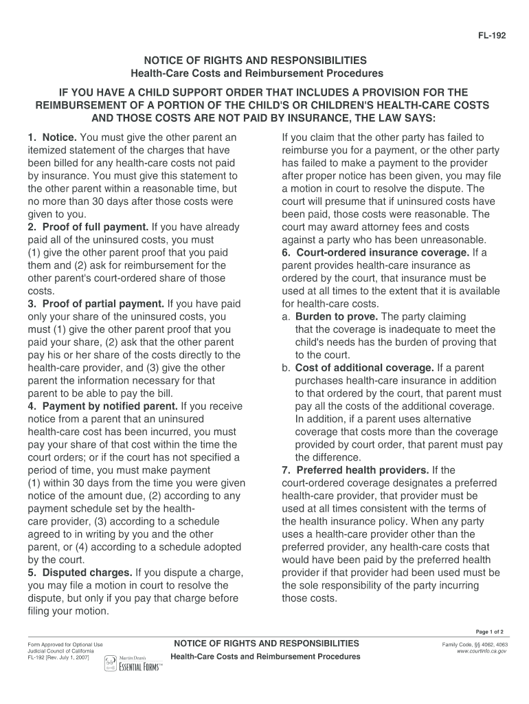 FL192 NOTICE OF RIGHTS AND RESPONSIBILITIES Healthcare Costs and Reimbursement Procedures IF YOU HAVE A CHILD SUPPORT ORDER THAT INCLUDES A PROVISION FOR THE REIMBURSEMENT OF A PORTION OF THE CHILD