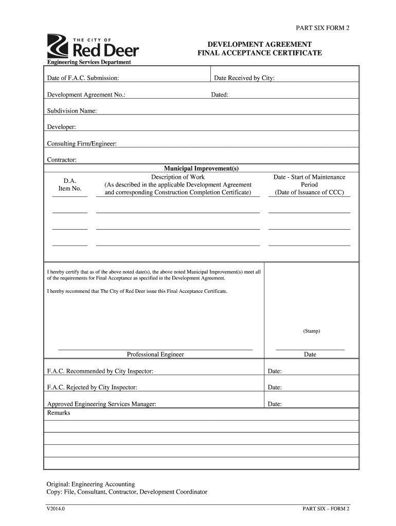 PART SIX FORM 2 DEVELOPMENT AGREEMENT FINAL ACCEPTANCE CERTIFICATE Engineering Services Department Date of F.A.C. Submission: Date Received by City: Development Agreement No.: Dated: Subdivision Name: