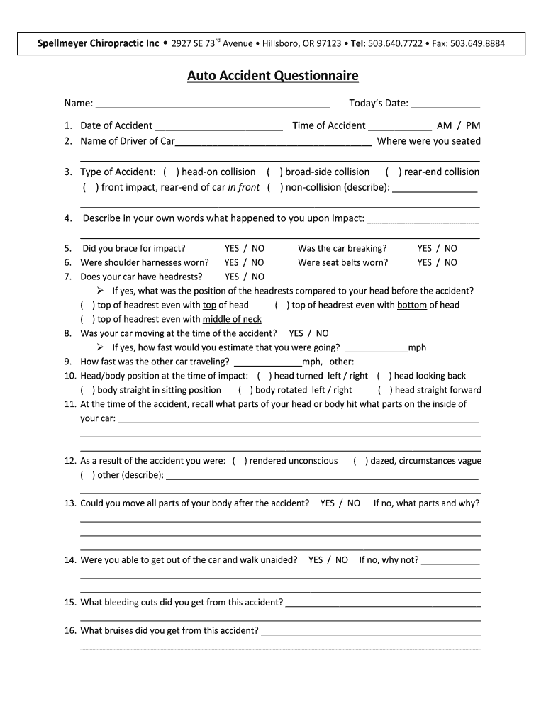 Get the free Auto Accident Questionnaire - Spellmeyer Chiropractic
