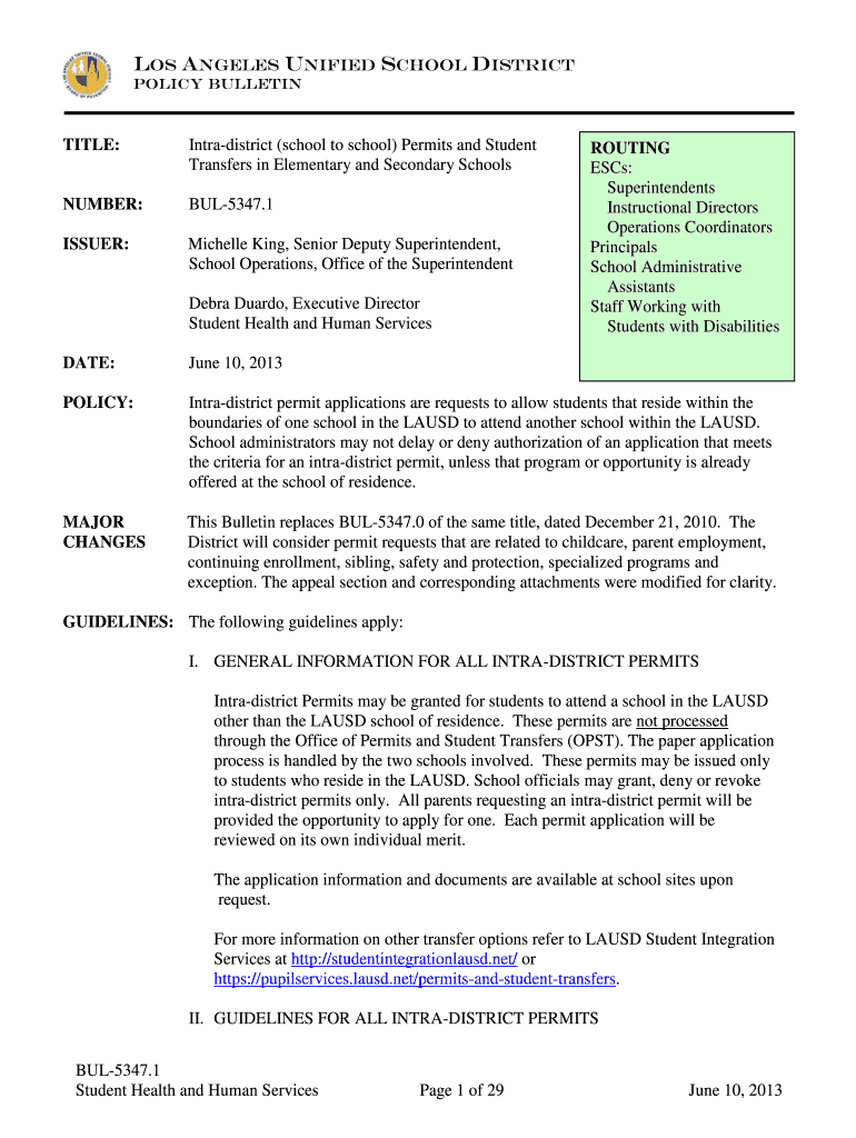 LOS ANGELES UNIFIED SCHOOL DISTRICT Policy Bulletin TITLE: Intradistrict (school to school) Permits and Student Transfers in Elementary and Secondary Schools NUMBER: BUL5347.1 ISSUER: Michelle King,