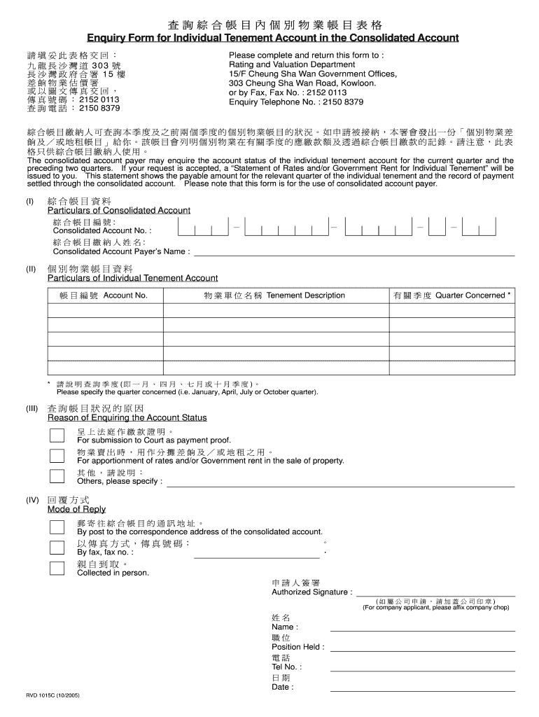 The Enquiry Form for Individual Tenement Account is a government form used by residents in Hong Kong to request account status information for individual tenement accounts.