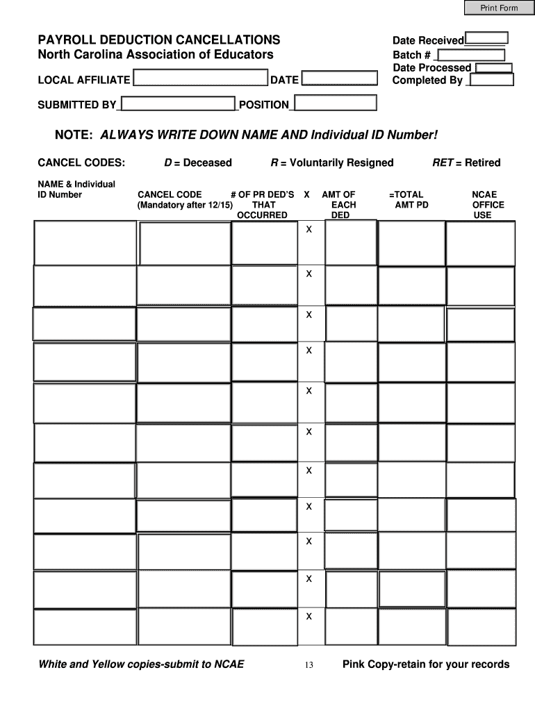 The primary audience for the payroll deduction cancellation form includes NCAE members who require changes in their payroll deduction status. This necessity may arise from various situations, such as job changes, retirement, or financial reassessments. Additionally, other stakeholders who utilize similar payroll deduction systems may also find this form applicable.