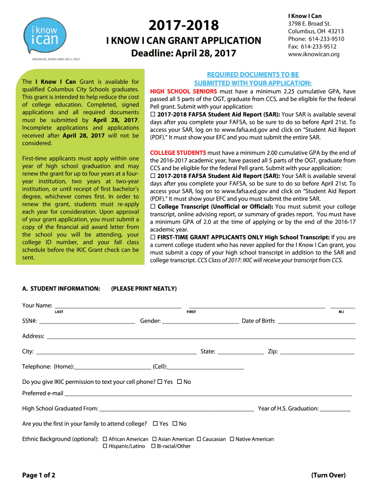 20172018 I KNOW I CAN GRANT APPLICATION Deadline: April 28, 2017, I Know I Can 3798 E. Broad St. Columbus, OH 43213 Phone: 6142339510 Fax: 6142339512 www.iknowican.org REQUIRED DOCUMENTS TO BE SUBMITTED