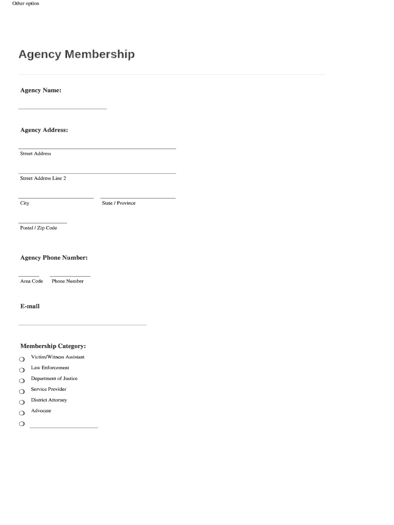 Other option Agency Name: Agency Address: Street Address Line 2 City State / Province Postal / Zip Code Agency Phone Number: Area Code Phone Number Email Membership Category: r Victim/Witness Assistant