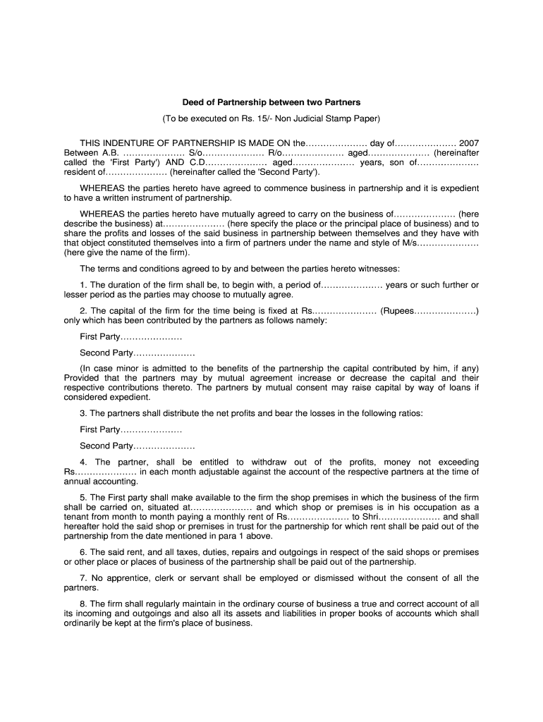 Deed of Partnership between two Partners (To be executed on Rs. 15/ Non-Judicial Stamp Paper) THIS INDENTURE OF PARTNERSHIP IS MADE ON the day of 2007 Between A.B. S/o R/o aged (hereinafter called