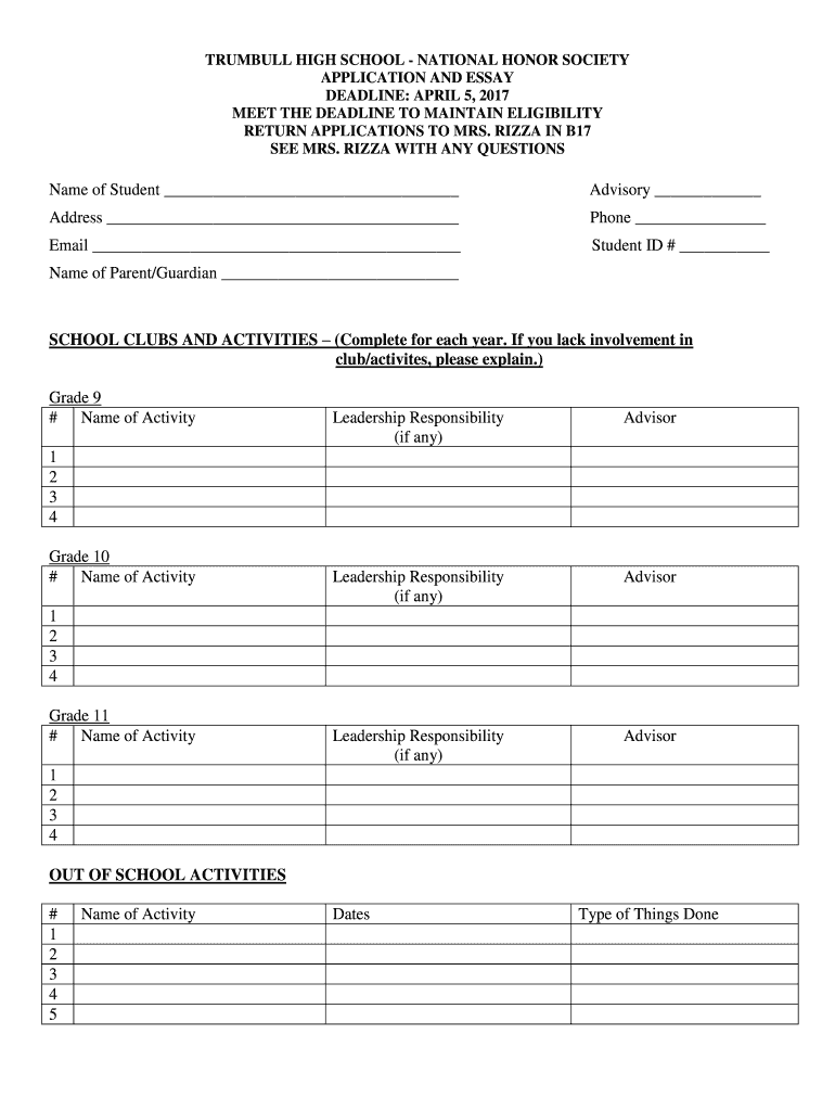 TRUMBULL HIGH SCHOOL NATIONAL HONOR SOCIETY APPLICATION AND ESSAY DEADLINE: APRIL 5, 2017, MEET THE DEADLINE TO MAINTAIN ELIGIBILITY RETURN APPLICATIONS TO MRS. PIZZA IN B17 SEE MRS. PIZZA WITH ANY