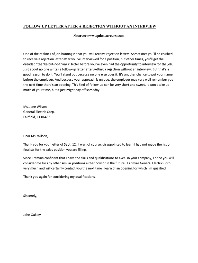 FOLLOW-UP LETTER AFTER A REJECTION WITHOUT AN INTERVIEW Source:www.quintcareers.com One of the realities of job hunting is that you will receive rejection letters. Sometimes you'll be crushed to receive