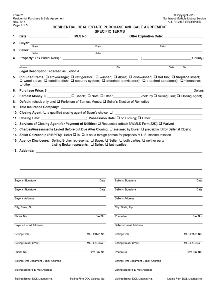 Form 21 Residential Purchase & Sale Agreement Rev. 7/15-Page 1 of 5 Copyright 2015 Northwest Multiple Listing Service ALL RIGHTS RESERVED RESIDENTIAL REAL ESTATE PURCHASE AND SALE AGREEMENT SPECIFIC