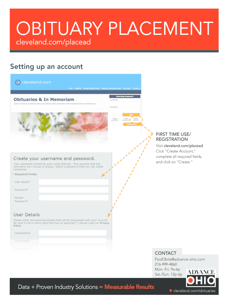 OBITUARY PLACEMENT cleveland.com/placeadSetting up an accountLogin or create an account to place your obituary and in memoriam in the newspaper and on cleveland.com.FIRST TIME USE/ REGISTRATIONVisit