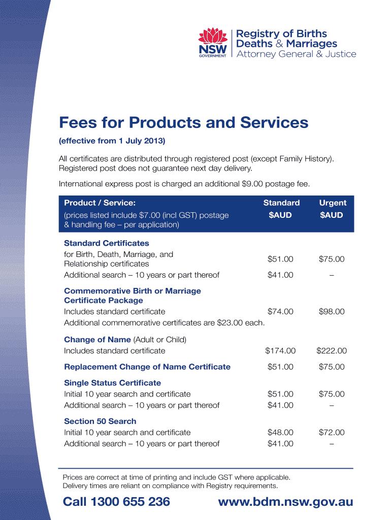 Fees for Products and Services (effective from 1 July 2013) All certificates are distributed through registered post (except Family History). Registered post does not guarantee next day delivery.
