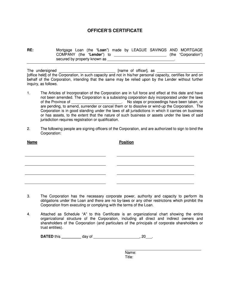 Clear Form OFFICERS CERTIFICATE RE: Mortgage Loan (the Loan) made by LEAGUE SAVINGS AND MORTGAGE COMPANY (the Lender) to (the Corporation) secured by property known as. The undersigned name of officer,