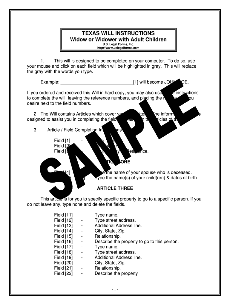 TEXAS WILL INSTRUCTIONS Widow or Widower with Adult Children U.S. Legal Forms, Inc. http://www.uslegalforms.com 1. This will is designed to be completed on your computer. To do so, use your mouse