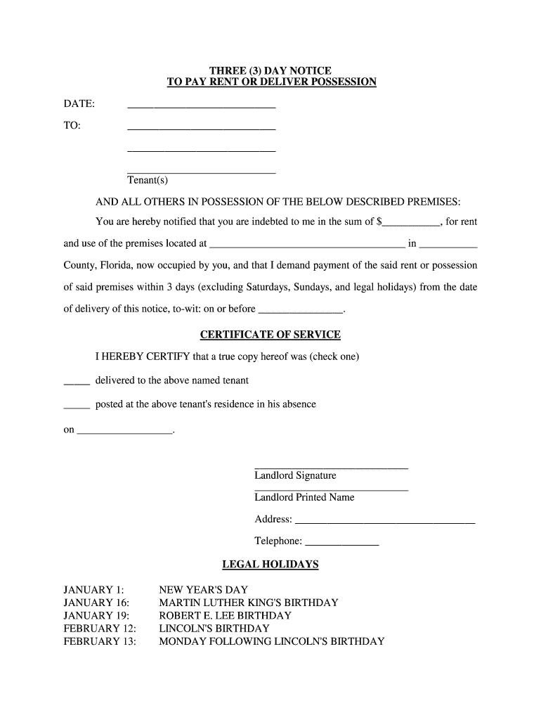 Yes, the notice should list any legal holidays in Florida, as they are factored into the three-day payment period.