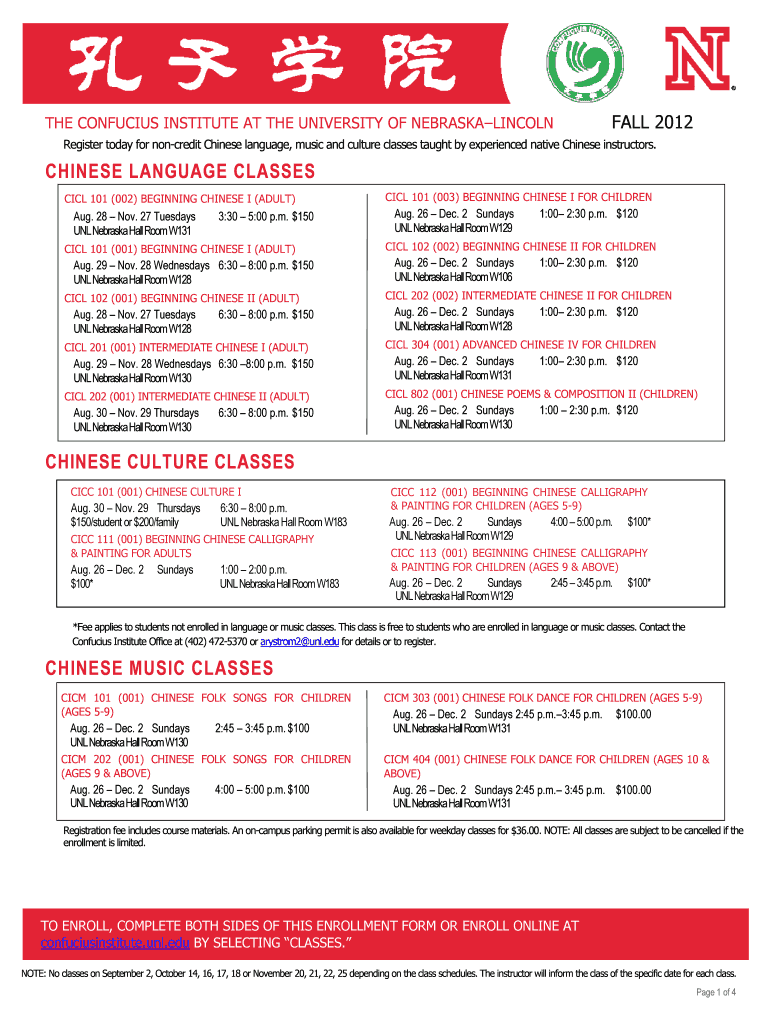 THE CONFUCIUS INSTITUTE AT THE UNIVERSITY OF NEBRASKALINCOLN FALL 2012 Register today for noncredit Chinese language, music and culture classes taught by experienced native Chinese instructors. CHINESE