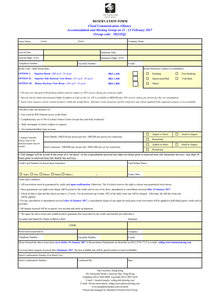 RESERVATION FORM Cloud Communication Alliance Accommodation and Meeting Group on 21 23 February 2017 (Group code: 3HJ1EQ) : (Last) Guest Name (First) Company Name : Arrival Date : Departure Date :