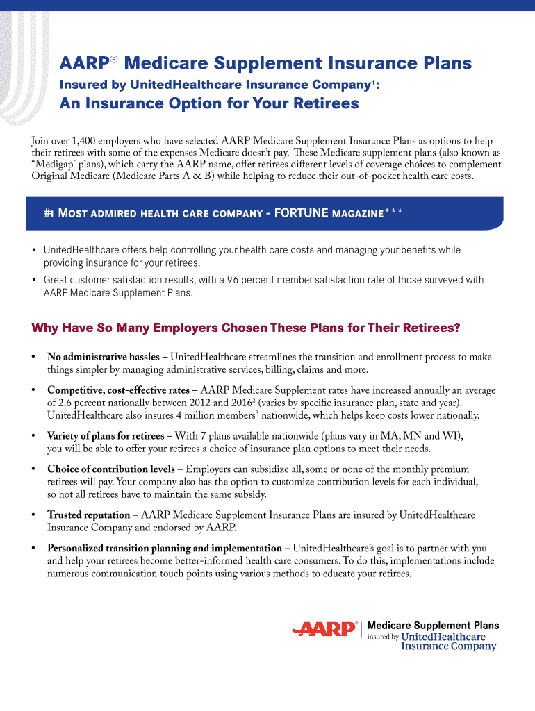 AARP Medicare Supplement Insurance Plans Insured by UnitedHealthcare Insurance Company:An Insurance Option for Your Retirees Join over 1,400 employers who have selected AARP Medicare Supplement Insurance