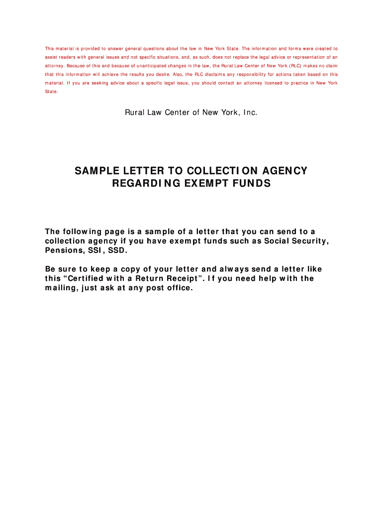 By sending this letter, individuals can assert their rights under the law and clarify that specific funds cannot be subjected to collection efforts. Properly notifying collection agencies is vital to safeguarding exempt income.