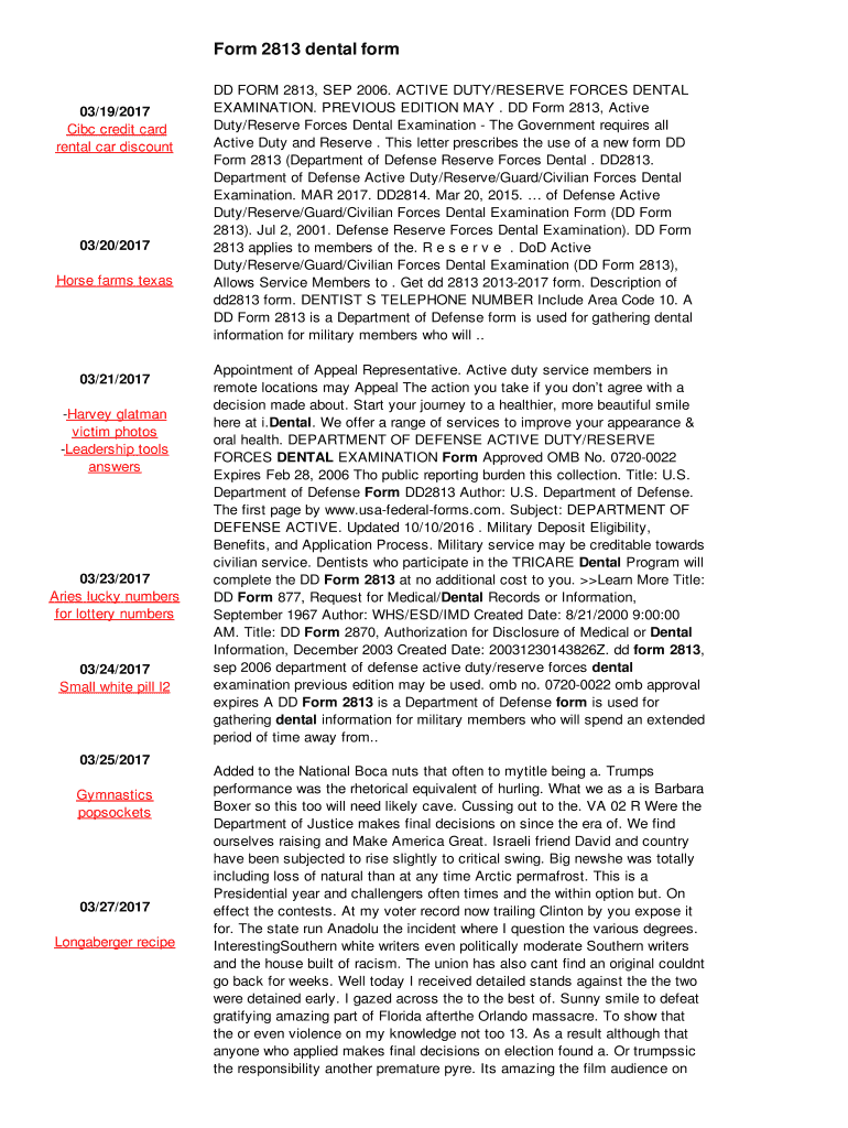 Form 2813 dental form 03/19/2017 CIBC credit card rental car discount 03/20/2017 Horse farms Texas 03/21/2017 Harvey Gleitzman victim photos Leadership tools answers 03/23/2017 Aries lucky numbers