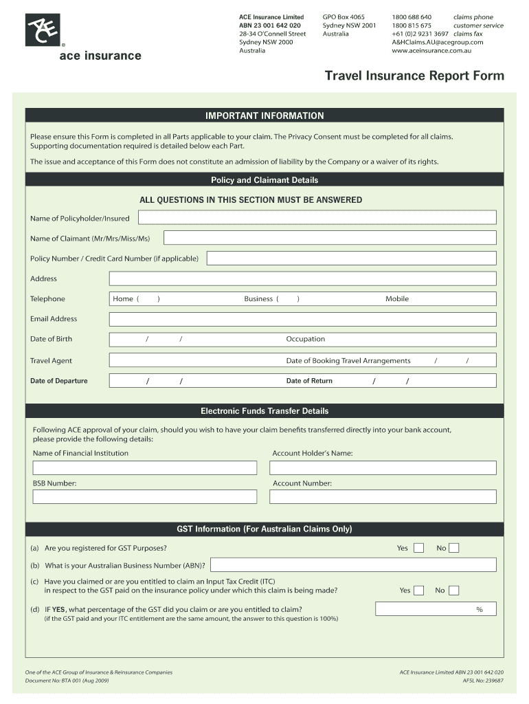 The ACE Travel Insurance Claim Form is an official document used by policyholders to report incidents and claim benefits related to travel insurance.
