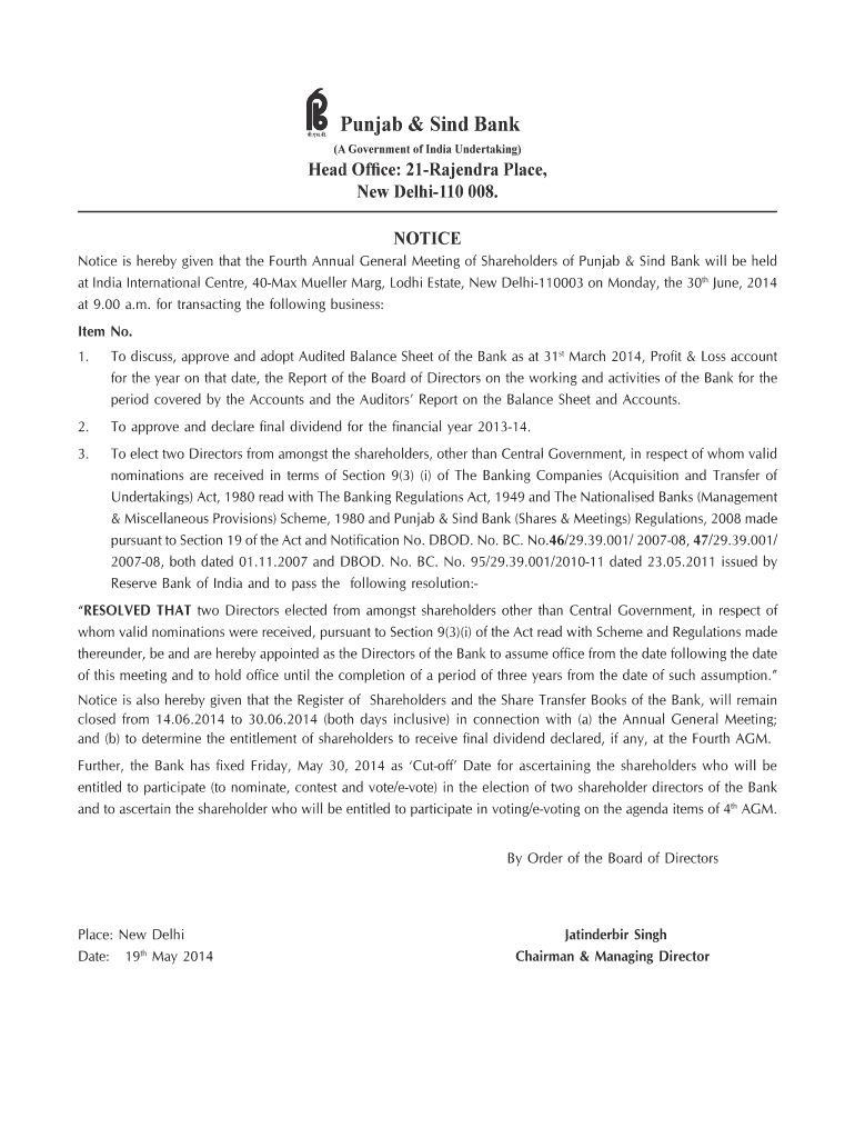 Punjab & Find Bank (A Government of India Undertaking) Head Office: 21Rajendra Place, New Delhi110 008. NOTICE is hereby given that the Fourth Annual General Meeting of Shareholders of Punjab & Find