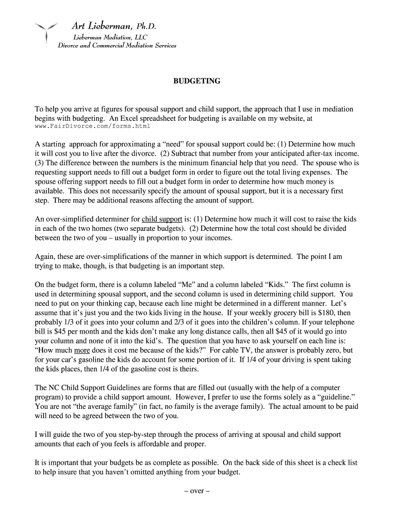 Art Lieberman, Ph.D. Lieberman Mediation, LLC Divorce and Commercial Mediation Services BUDGETING To help you arrive at figures for spousal support and child support, the approach that I use in mediation