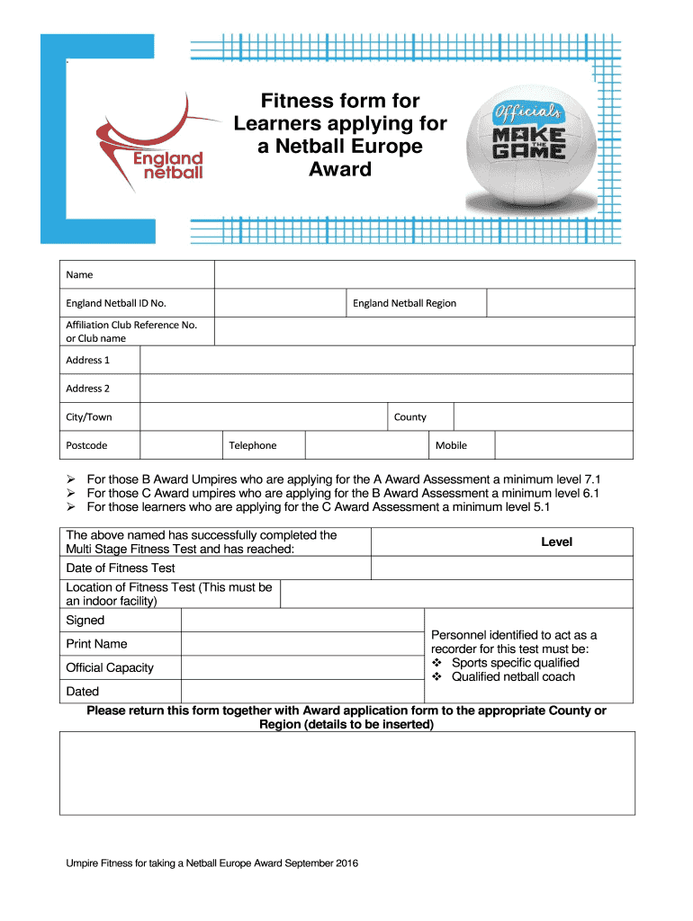 . Fitness form for Learners applying for a Netball Europe Award Name England Netball ID No. England Netball Region Affiliation Club Reference No. or Club name Address 1 Address 2 City/Town Postcode