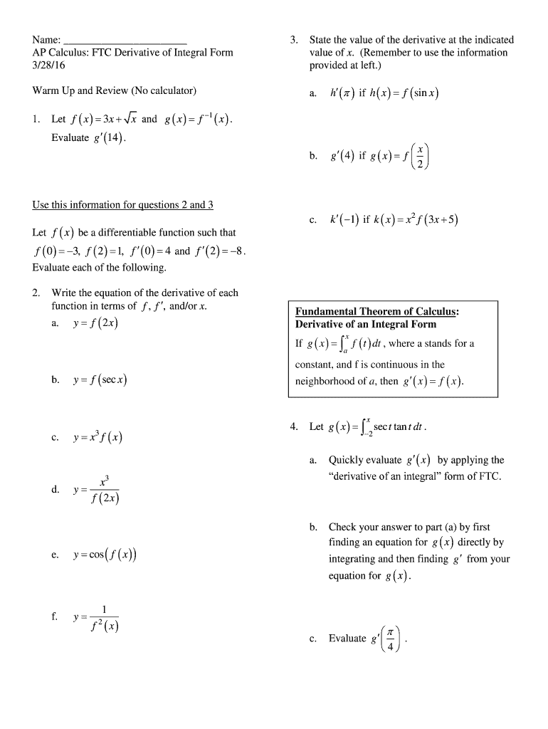 Name: AP Calculus: FTC Derivative of Integral Form 3/28/16 3. State the value of the derivative at the indicated value of x. (Remember to use the information provided at left.) a. 1. H if h × f sin