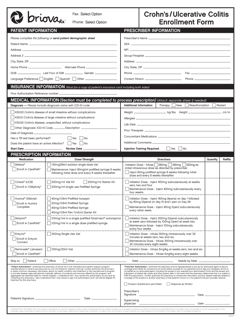 Crowns/Ulcerative Colitis Enrollment Form Fax: Select Option Phone: Select Option PATIENT INFORMATION PRESCRIBER INFORMATION Please complete the following or send patient demographic sheet Prescribers