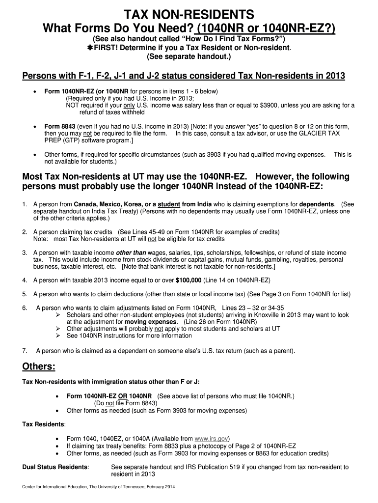 TAX NONRESIDENTS What Forms Do You Need? (1040NR or 1040NREZ?) (See also handout called How Do I Find Tax Forms?) FIRST! Determine if you have a Tax Resident or Nonresident. (See separate handout.)