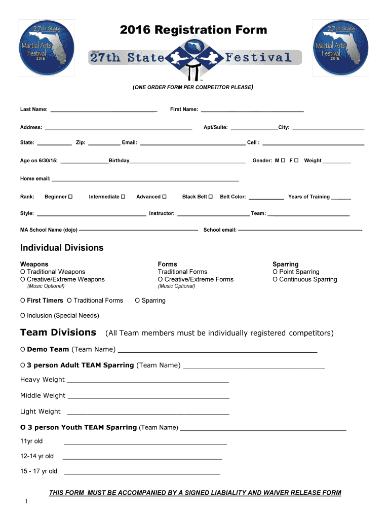 Get the free 2016 Registration Form - 27th State Martial Arts Festival