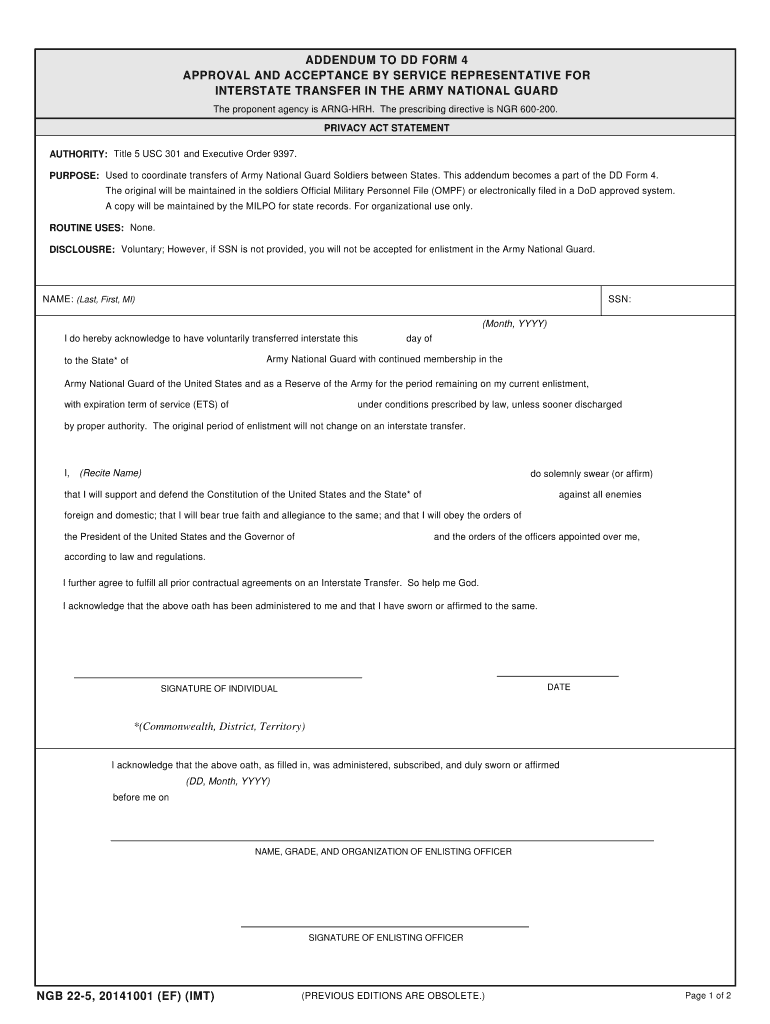 ADDENDUM TO DD FORM 4 APPROVAL AND ACCEPTANCE BY SERVICE REPRESENTATIVE FOR INTERSTATE TRANSFER IN THE ARMY NATIONAL GUARD The proponent agency is ANGER. The prescribing directive is NOR 600200. PRIVACY