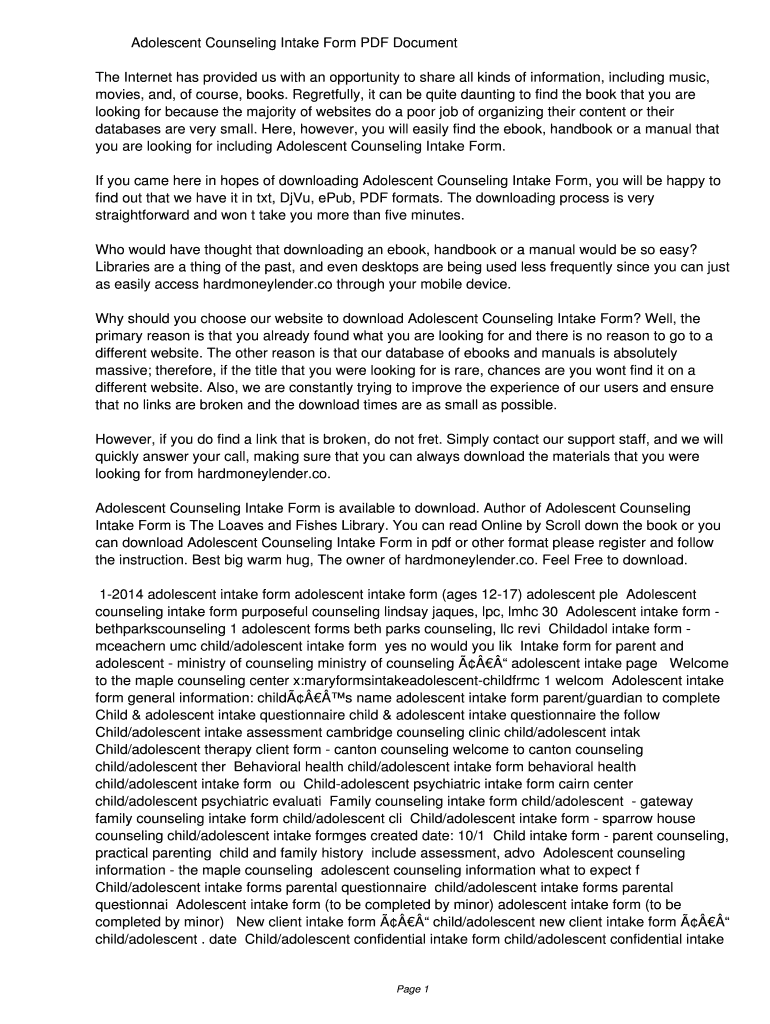 Adolescent Counseling Intake Form PDF Document The Internet has provided us with an opportunity to share all kinds of information, including music, movies, and, of course, books. Regretfully, it can