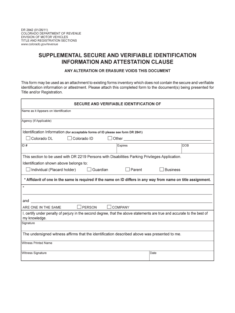 The Colorado Secure and Verifiable ID Attestation Form, officially known as DR 2842, serves the critical function of providing secure identification information for various motor vehicle transactions within Colorado. This form is particularly vital as it ensures that any motor vehicle services that necessitate proof of identity, such as registration or title transfers, are completed accurately and legally.