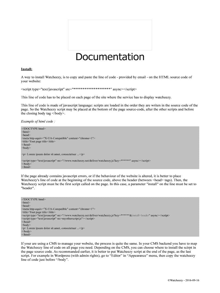 Documentation Install: A way to install Watched, is to copy and paste the line of code provided by email on the HTML source code of your website: script type “text/JavaScript src “********************